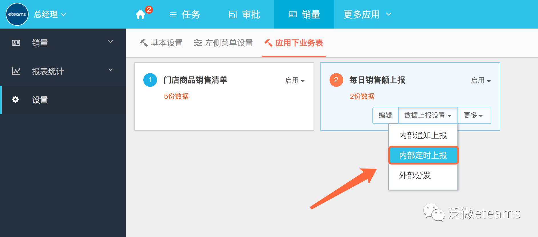 搭建完表单后,我们需要各门店人员可以每天按时填写表单的内容并提交到管理者手中,通过表单的定时上报设置,可以建立相应的上报规则,具体的操作步骤如下: