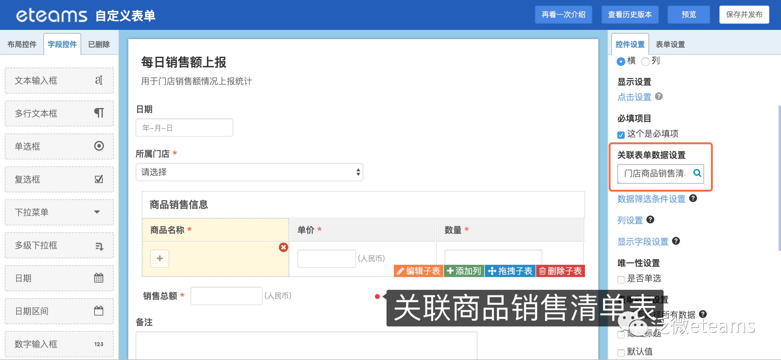 在这个场景中,我们需要通过自定义表单功能搭建两张表单,一张是《门店的销售商品清单》,一张是《每日门店数据上报》,两张表直接相互关联,实现每日上报的商品信息来源于销售清单中。整体的表单搭建不难,简单总结了需要注意的几点事项:
