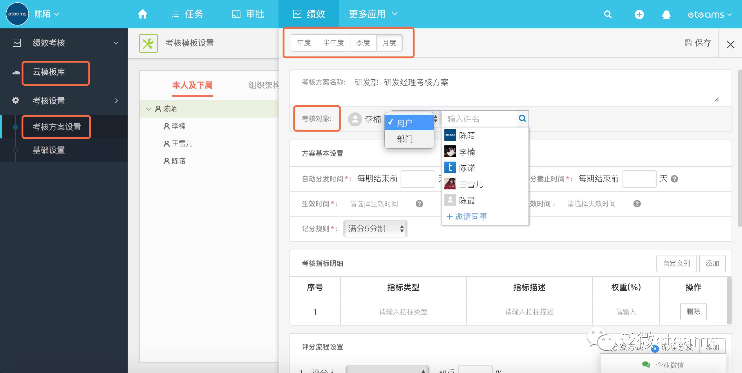 4、此外,根据团队的绩效管理需要,还可以设置考核模板的权限、评分权限、有效时间规范等等。
