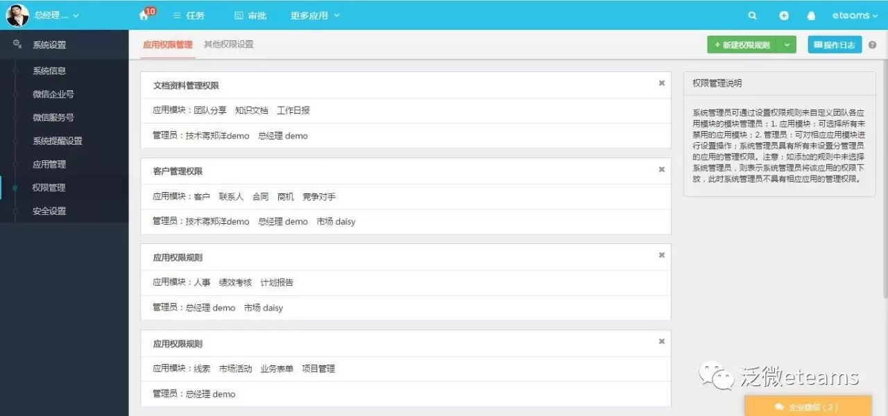 ● 公司以事为中心——事务权限;以需要推进的项目或者需要完成的任务为重心设置的事务权限,可以帮助公司员工在保障数据安全的同事畅通沟通协作,例如:公司接到eteams定制需求,建立一个《eteams定制任务》,领导可以将项目安排给负责人技术部门张某负责,张某就拥有除删除任务的其他所有权限;负责人就可以根据定制需要将技术部门的李某、王某设置成参与人,eteams自动赋予参与人一定权限共同工作,并将与客户对接的销售设置为只能了解任务进展和参与讨论共享人,方便打通技术与客户的沟通壁垒。