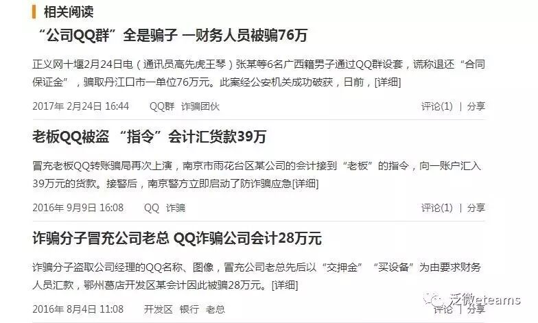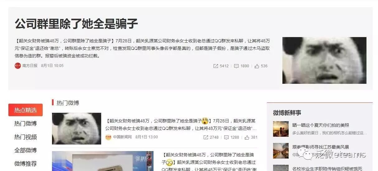 万幸的是李女士及时发现了问题,打电话给老板确认发现上当后,及时报警,总额48万元险被骗走的资金被成功拦截。但是,这样的利用伪造公司群诈骗的新闻已经不是第一次上热搜了,2016年6月锡城一家公司的会计遇到在微信群中遇到了类似的情况,女会计被骗136万上了次日的热搜,打开新闻此类相关阅读更是多不胜数!