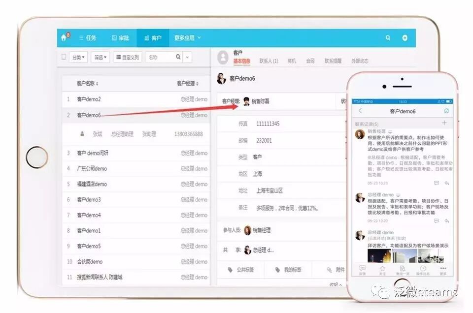 ● 泛微eteams的销售经理要求手下的销售“客户信息卡片”的“联系记录”中详细记录销售过程:包括通过什么方式联系了什么人,做了哪些沟通,有什么成果等等基本过程。