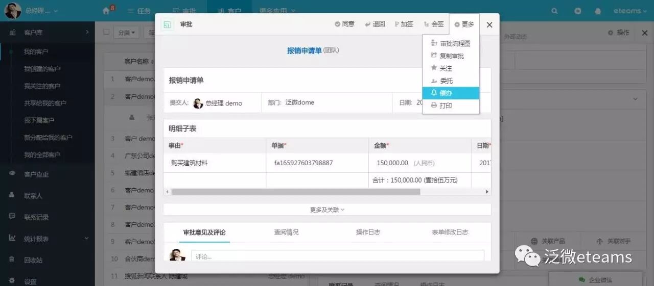 ● 需要紧急外出的销售可以通过审批关联项目和客户来做线上沟通请示,节约重要时刻的宝贵时间。