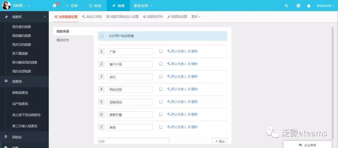 ● 在泛微eteams的「CRM」中,不管是员工自己建立,还是通过打通第三方渠道带来的线索都会被分类存储在不同线索池中,统一收录管理起来。