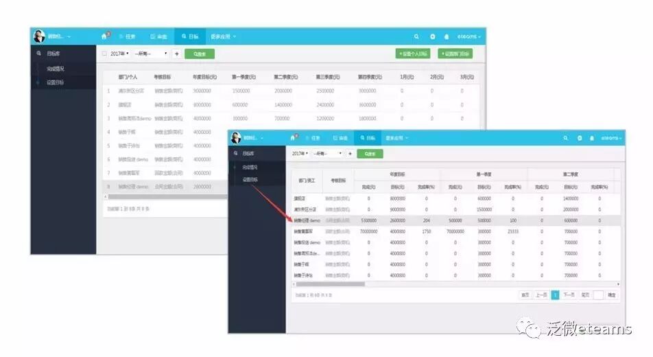 ● 公司制定好销售目标后,销售经理通过「目标管理」来分解目标,按照运营习惯和团队规模等不同可以设置部门/个人考核目标。例如:连锁店可以通过设置闵行区分店、普陀区分店、静安分店等部门考核目标,店长在自己的eteams再次细化为个人目标,小团队可以直接分解为个人目标。之后,「目标管理」会自动关联合同、商机、汇款等自动多角度数据联动,销售经理只要打开「目标管理」就能看到所有目标的进展完成情况。