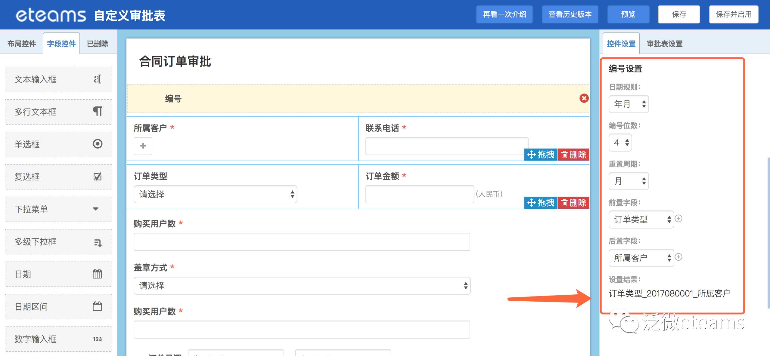 ●合同的编号管理?使用编号控件,新建编号的规则,例如“合同类型+年月+客户“,每一次订单提交即可根据规则自动灵活地生成编号信息。
