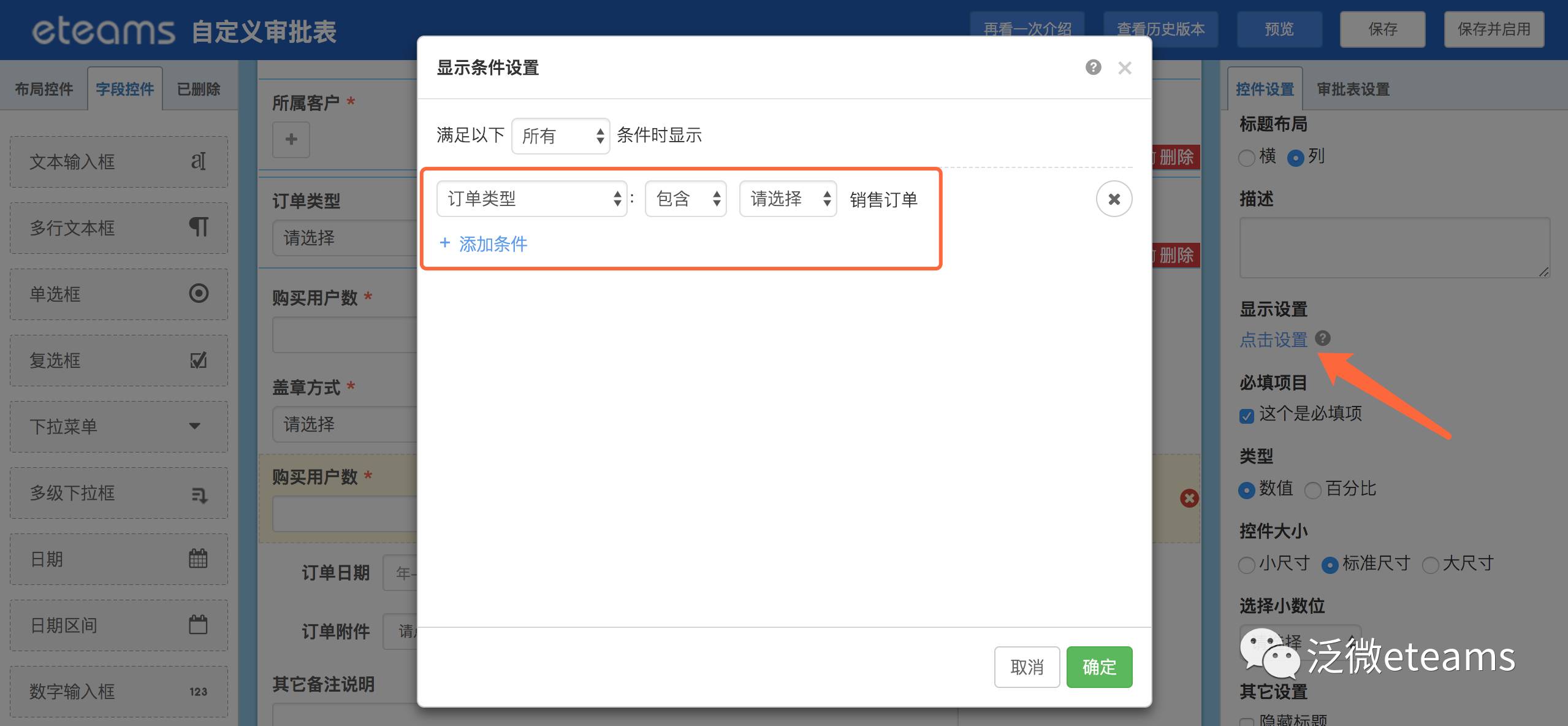 ● 同时管理不同的订单类型?一张表单就够了,通过多级下拉控件维护订单类型,同时设置对应类型的信息显示,例如当订单类型为【销售订单】时,可以自动显示【购买用户数】的信息。