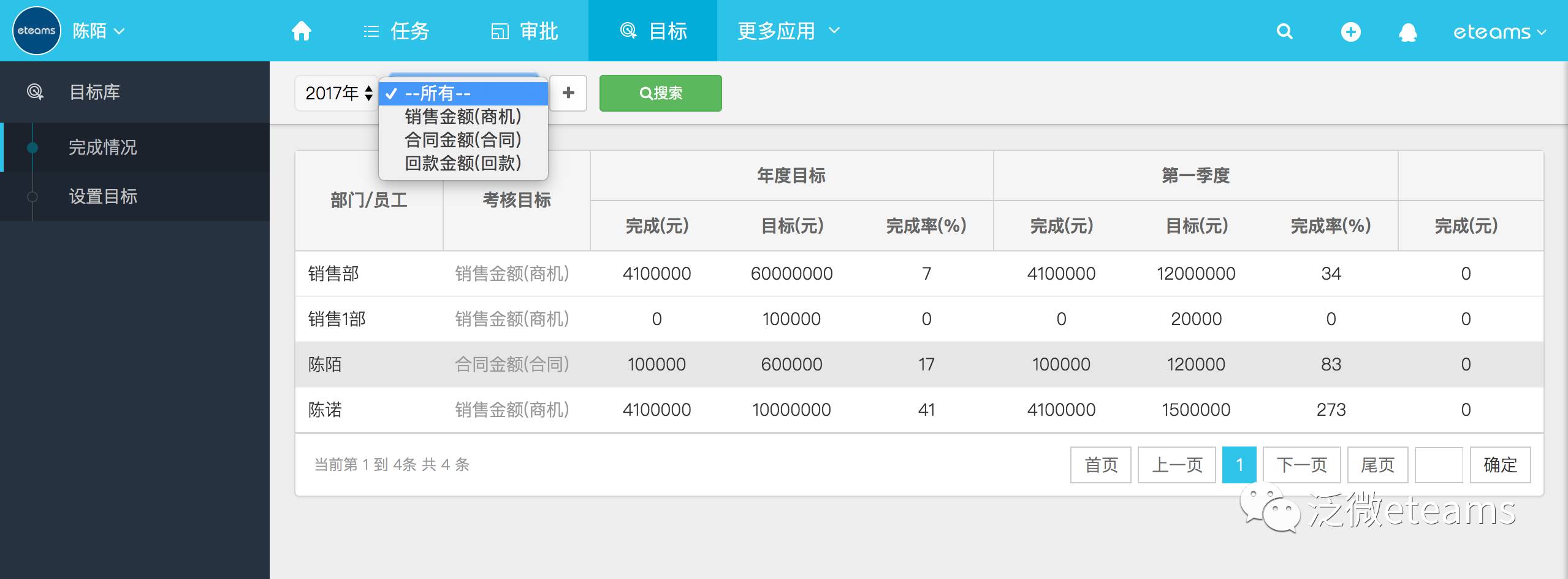 而目标管理应用则可以帮助企业考核月度、季度、年度重要的销售指标的完成情况,包括商机销售金额、合同金额和回款金额等,既可以实现每个员工的个性化目标管理,每个目标成效结果也直观清晰。