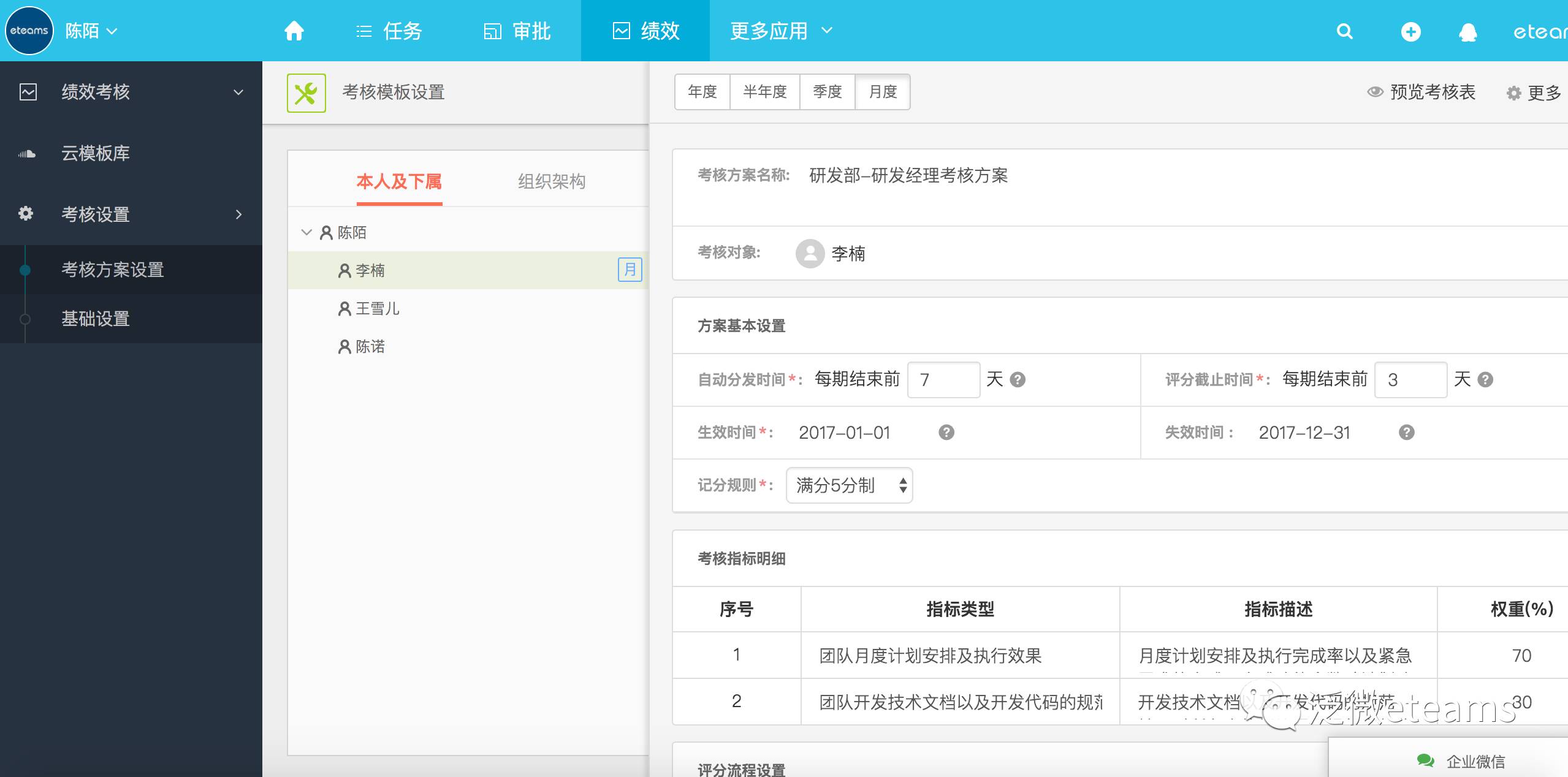 同时为了保证参与感,确认的方案也需要向各自的员工同步。一个是通用的企业考核规范和标准,可以通过文档共享让员工了解学习,另外针对性的员工方案,人事则可以通过审批确认的形式同步。只有明确了规范和标准,那么具体指标的考核才更心中有数。