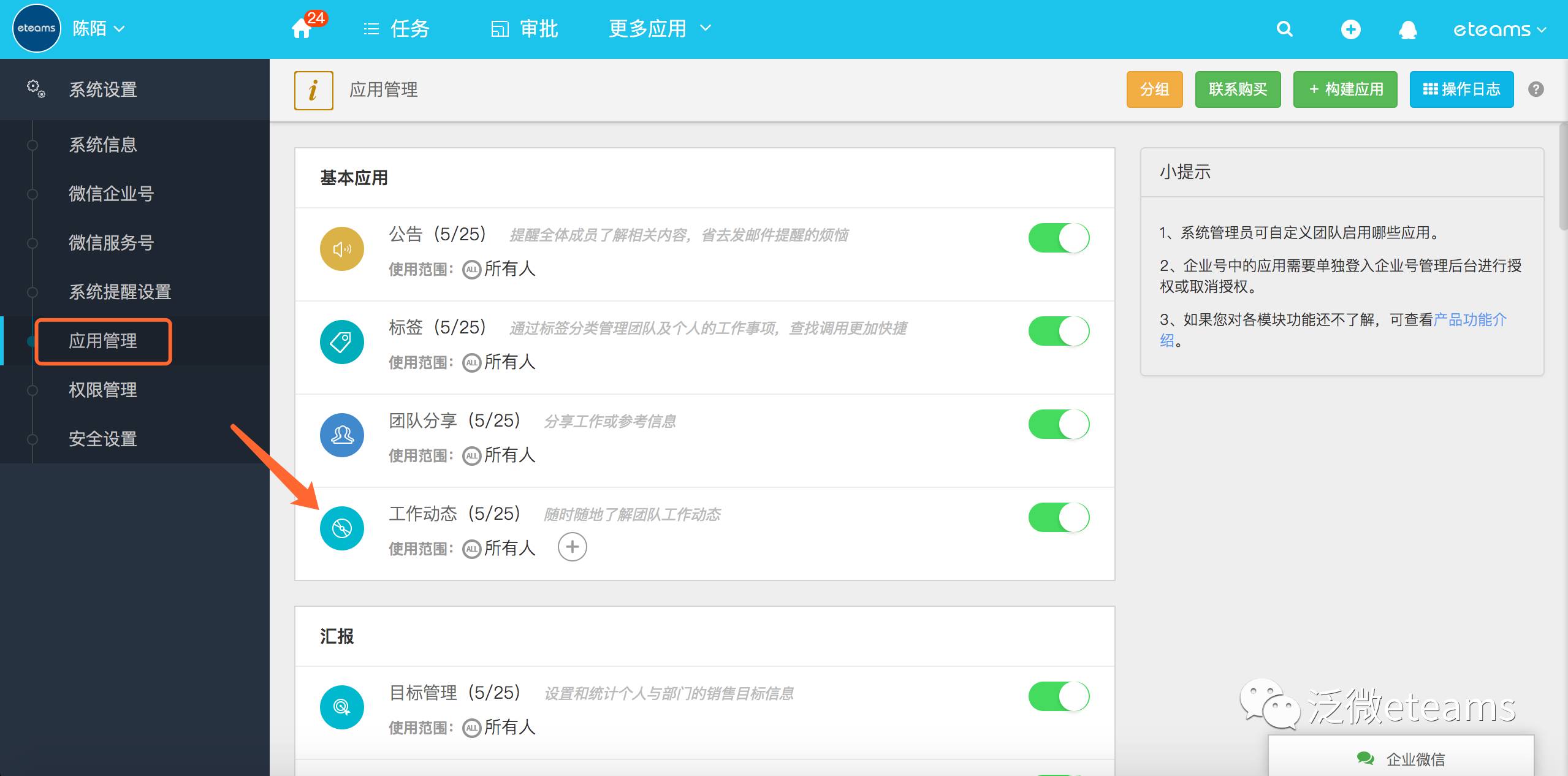 2、团队工作动态模块也可以设置启用关闭以及指定使用范围啦,应用权限更灵活,工作隐私更安全