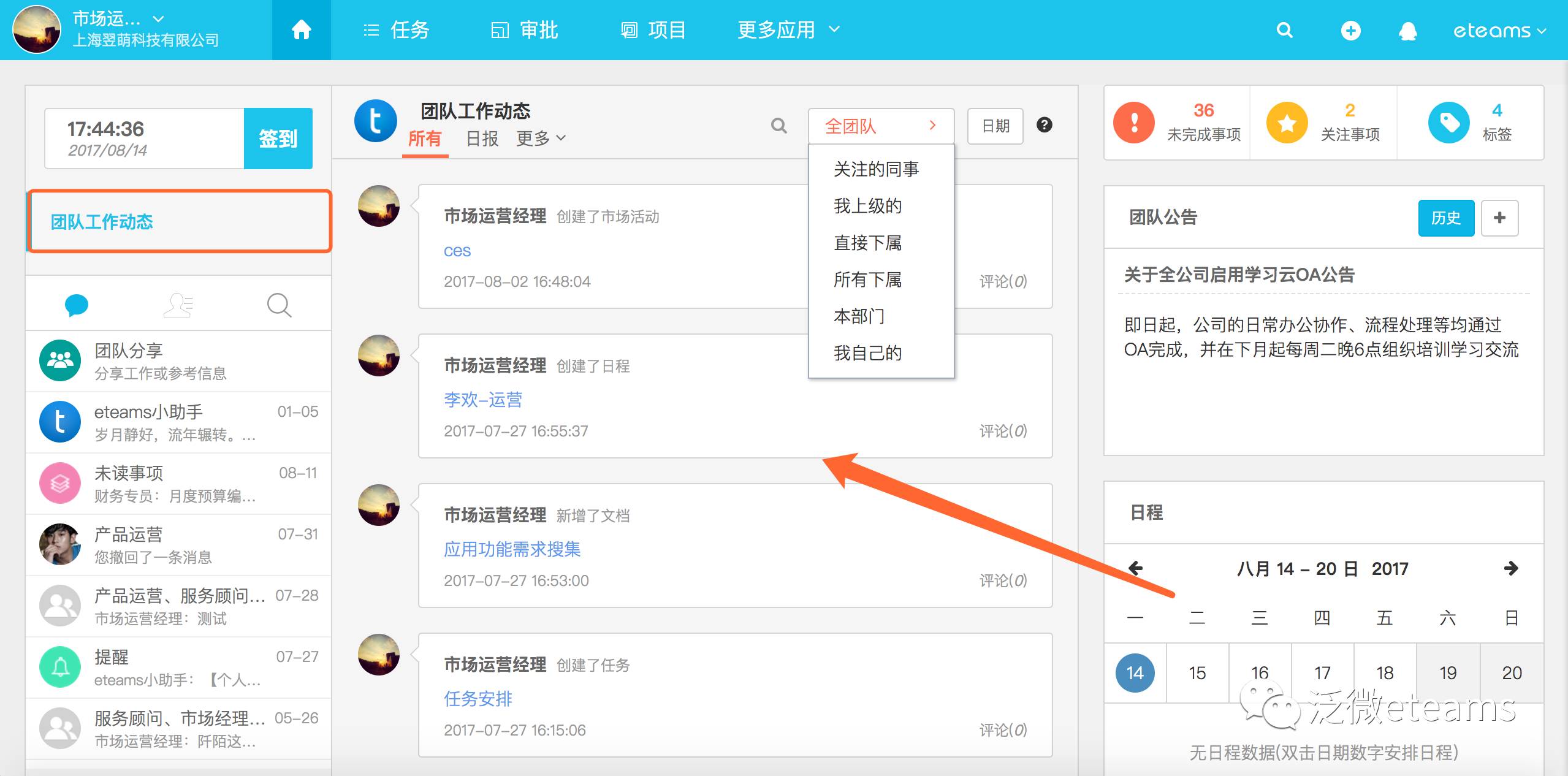 团队工作动态入口在首页位置,完整地记录了团队所有人员的办公协作记录,例如谁发起了一项审批,谁上传了一份文档等等。针对管理层,可以快速地了解下属的工作落实情况,同事间也可以互相了解本部门的工作轨迹。
