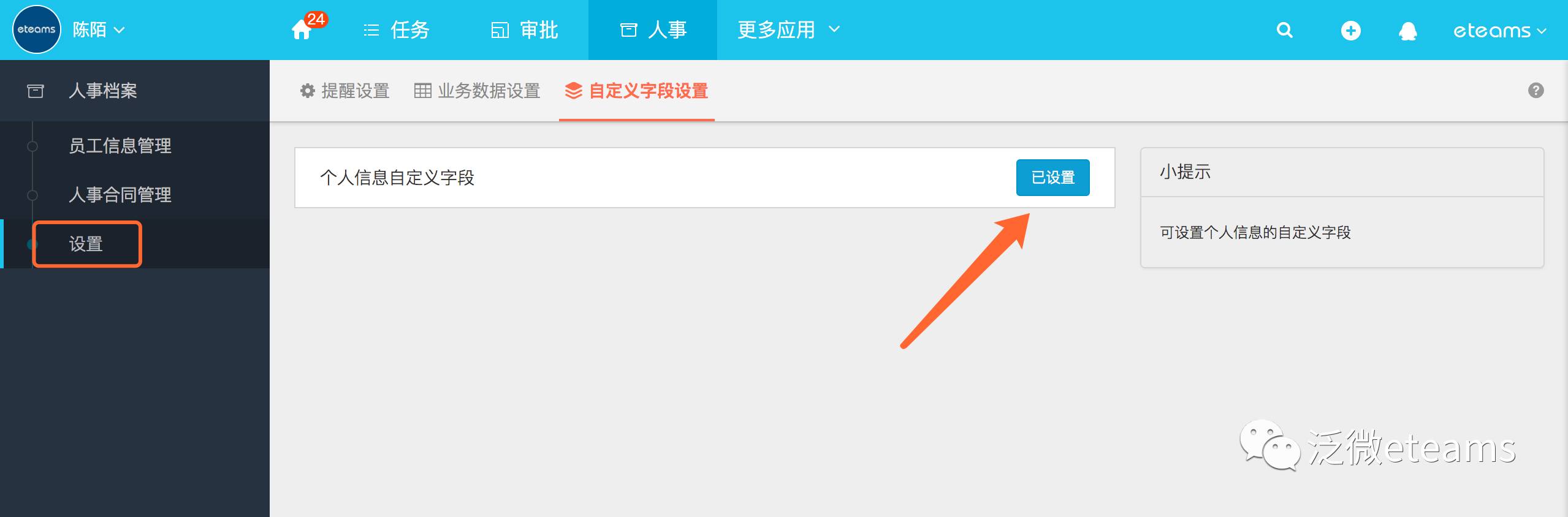 在人事档案模块中进入到【设置】-【自定义字段设置】页面,即可通过自定义表单搭建相应信息字段,如语言水平、计算级水平等。