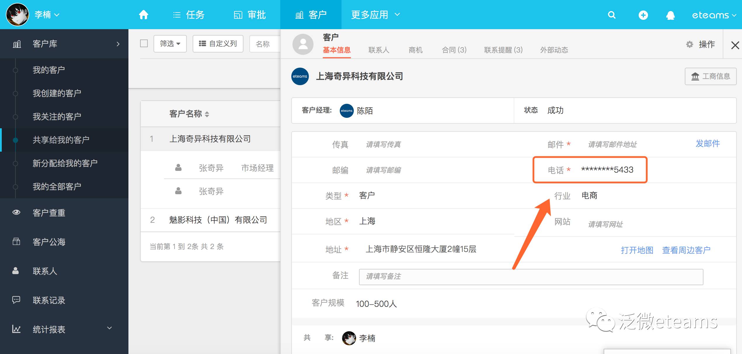 在【客户】应用设置中,进入到【字段权限设置】,对客户、联系人卡片中的每一个字段都可以设置查看和编辑的人员范围。例如对于客户卡片中的【电话】设置了共享人不可见完整的号码信息且不可编辑,则作为共享人的李楠,在查看【共享给自己客户】时,客户的号码状态如图所示。