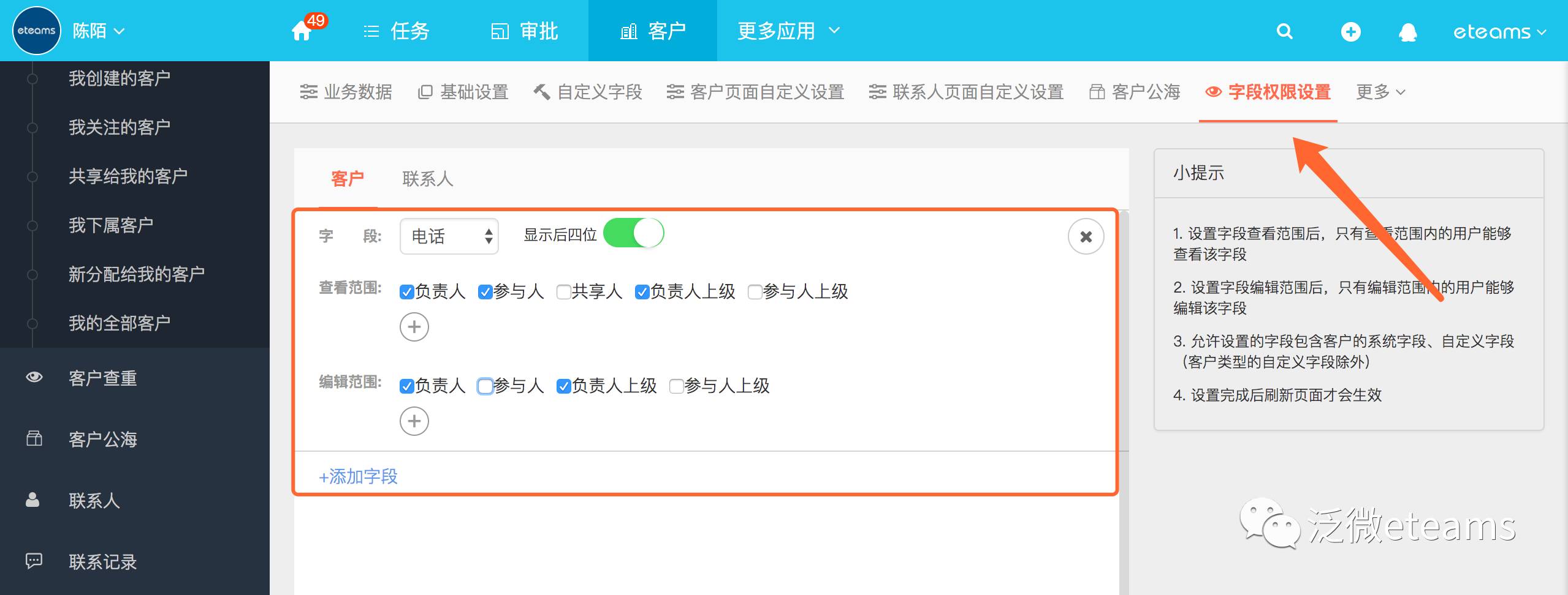 1、客户联系人应用中的字段可以进行查看和编辑权限设置,防止信息的泄露和随意修改,重要信息的安全性更有保障