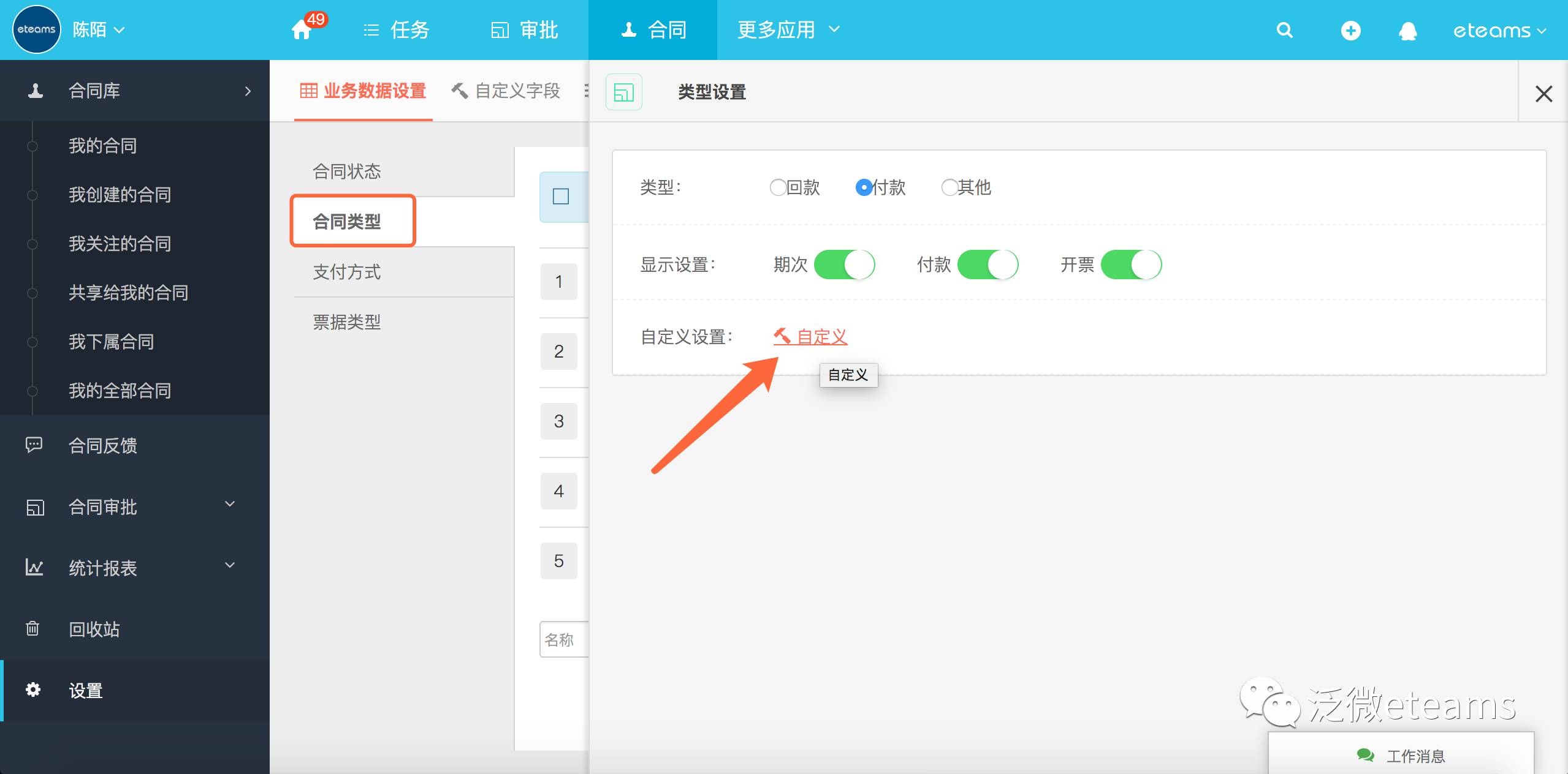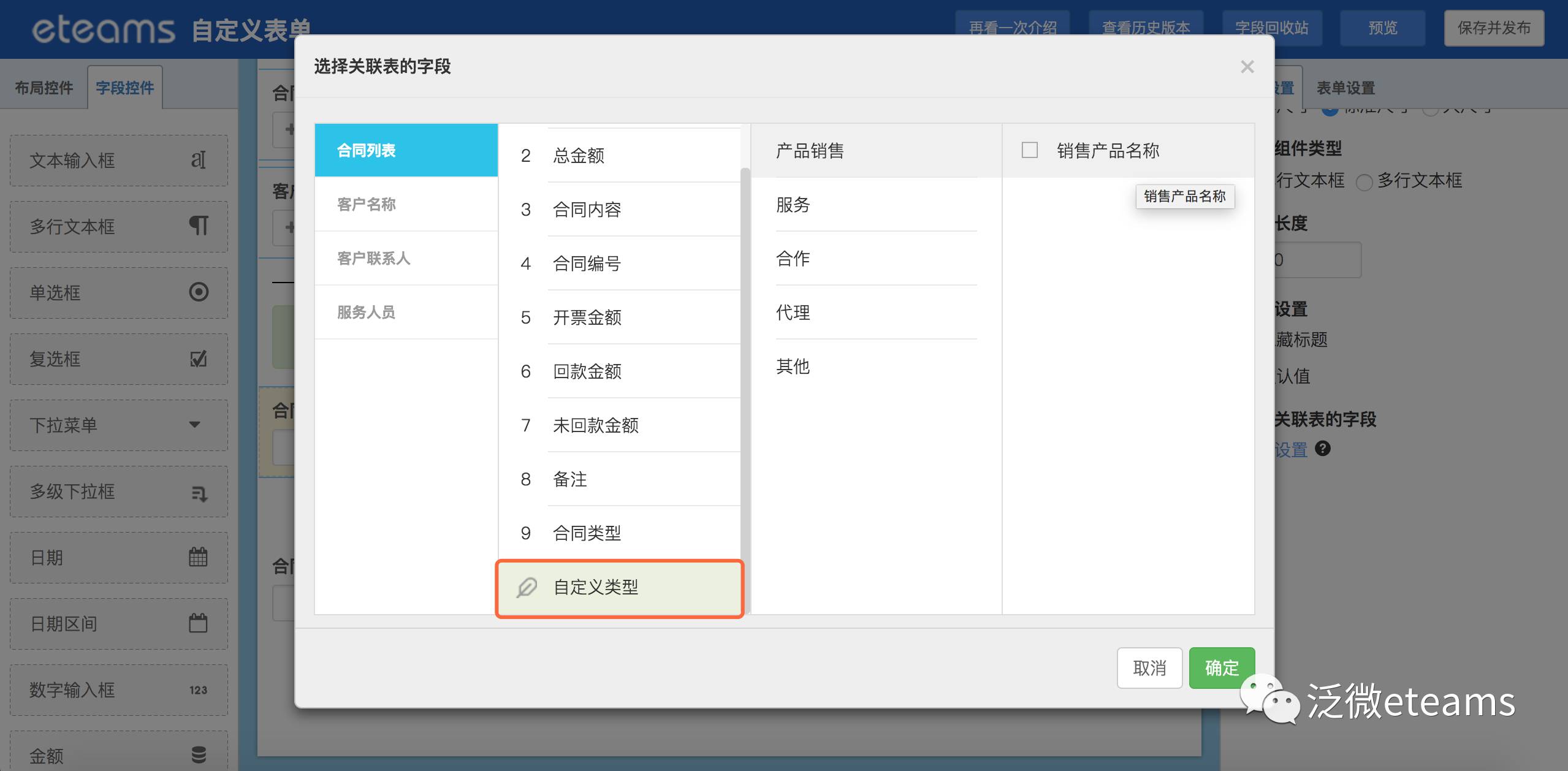 3、合同应用中的字段钻取更完善,对于合同类型中的自定义字段,比如类型为代理的合同,对应自定义的字段为【代理产品名称】,那这个自定义的内容也可以被关联钻取到了