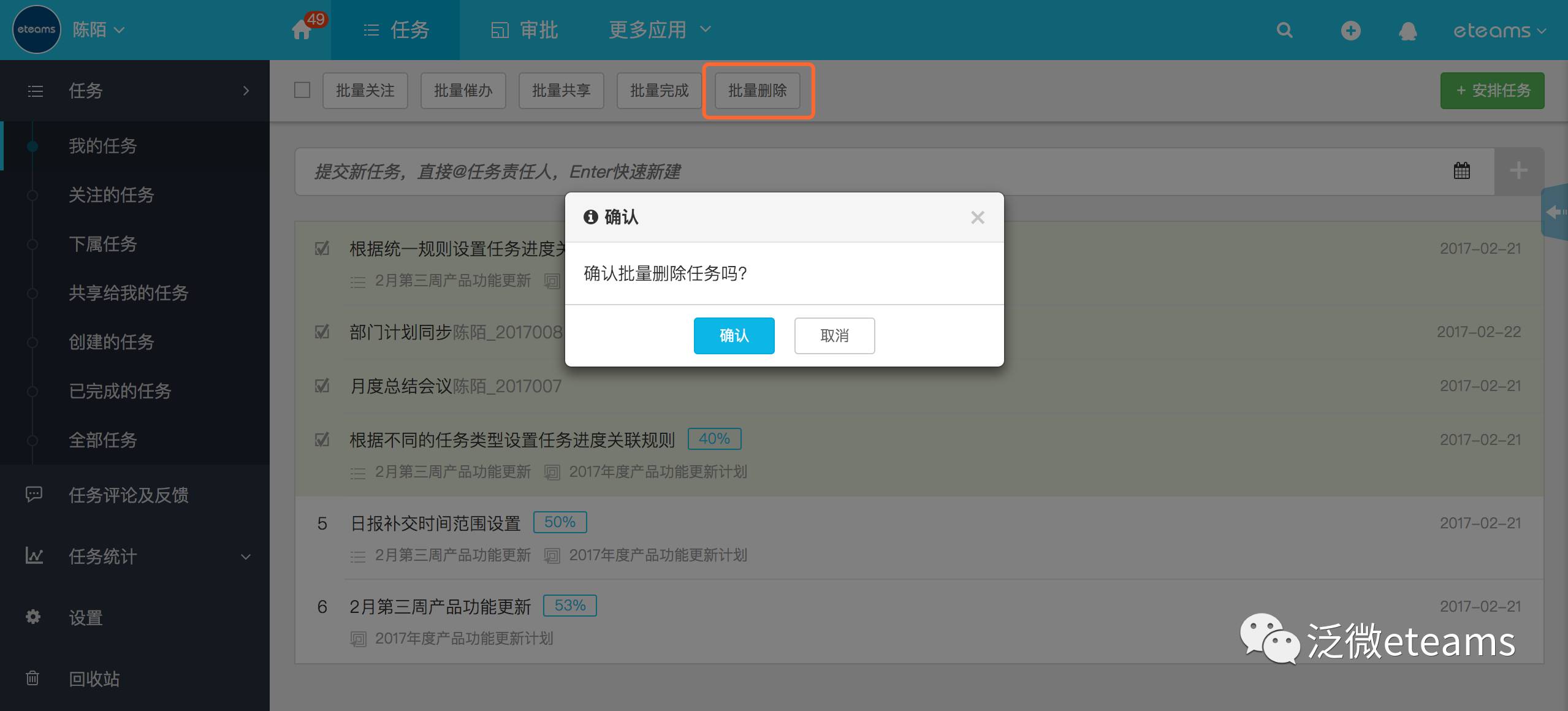 删除管理无效的任务,除了进入到详细的任务卡片里,下拉【更多】-【删除】外,现在我们在任务列表页也可以直接删除了,选中任务后还可以进行批量操作,删除步骤简单化,同时支持多个任务删除也更方便。