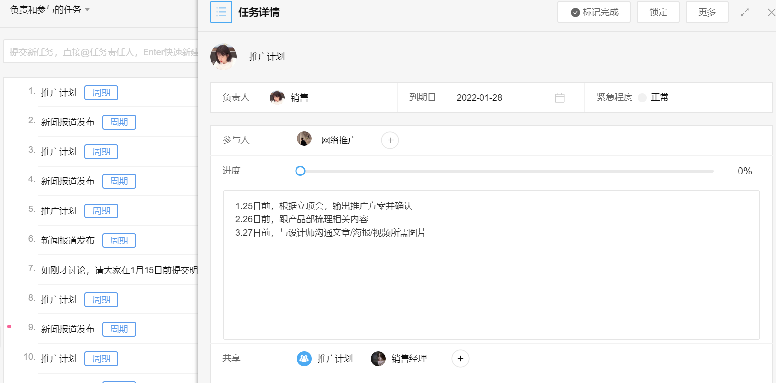 例如,借助【任务】应用,自我安排任务,包括任务完成的时间,目标,并告知领导达成共识,系统自动记录好每次推进记录;