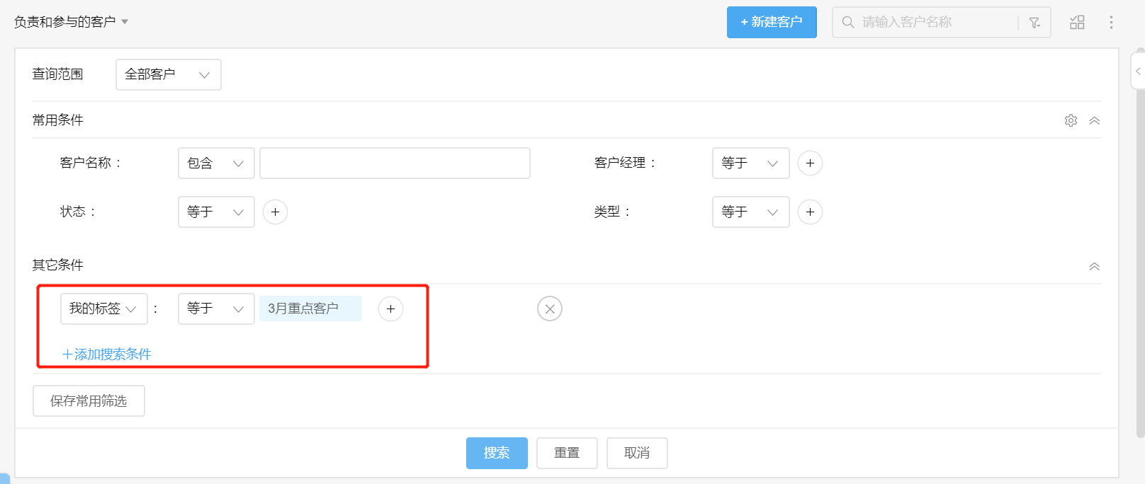 通过高级筛选器,就可以快速把这类标签客户找出查看并联系
