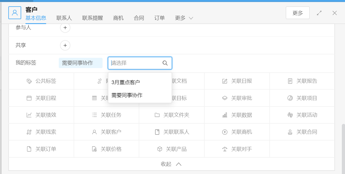在CRM中每个销售都可按照自己的销售漏斗或者对用户维度的划分,建立个人标签,比如给客户打上“需要同事协作”“3月重点客户”的多个客户标签