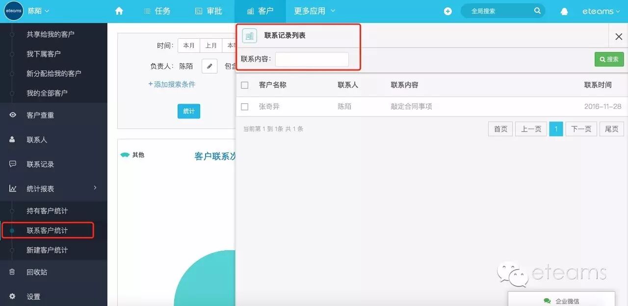 【联系人】模块中点击客户联系统计中的具体统计图,可以查看联系评论明细。联系内容搜索查找,帮助亲们更好地管理客户联系的记录,客户联系状态维护更简单~