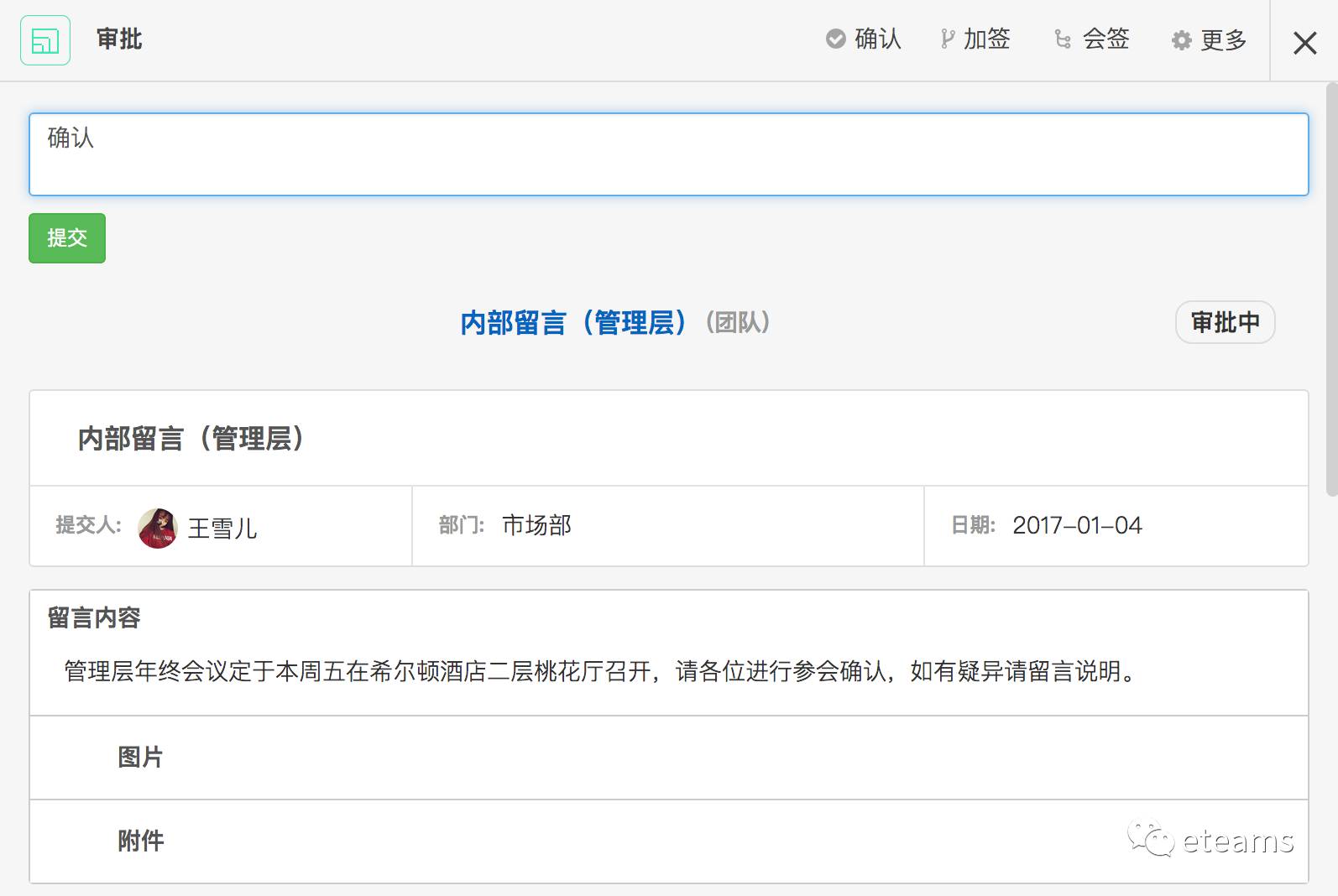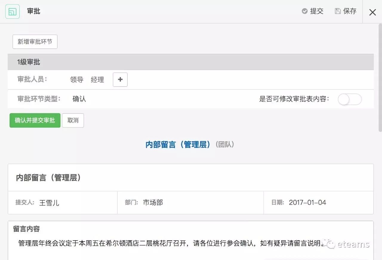 以年终管理层会议为例,需向公司经理及以上职级人员发送会议确认通知,公司的管理层人数较多并且跨部门,因此可以通过使用针对管理层的内部留言表单快速确认。
