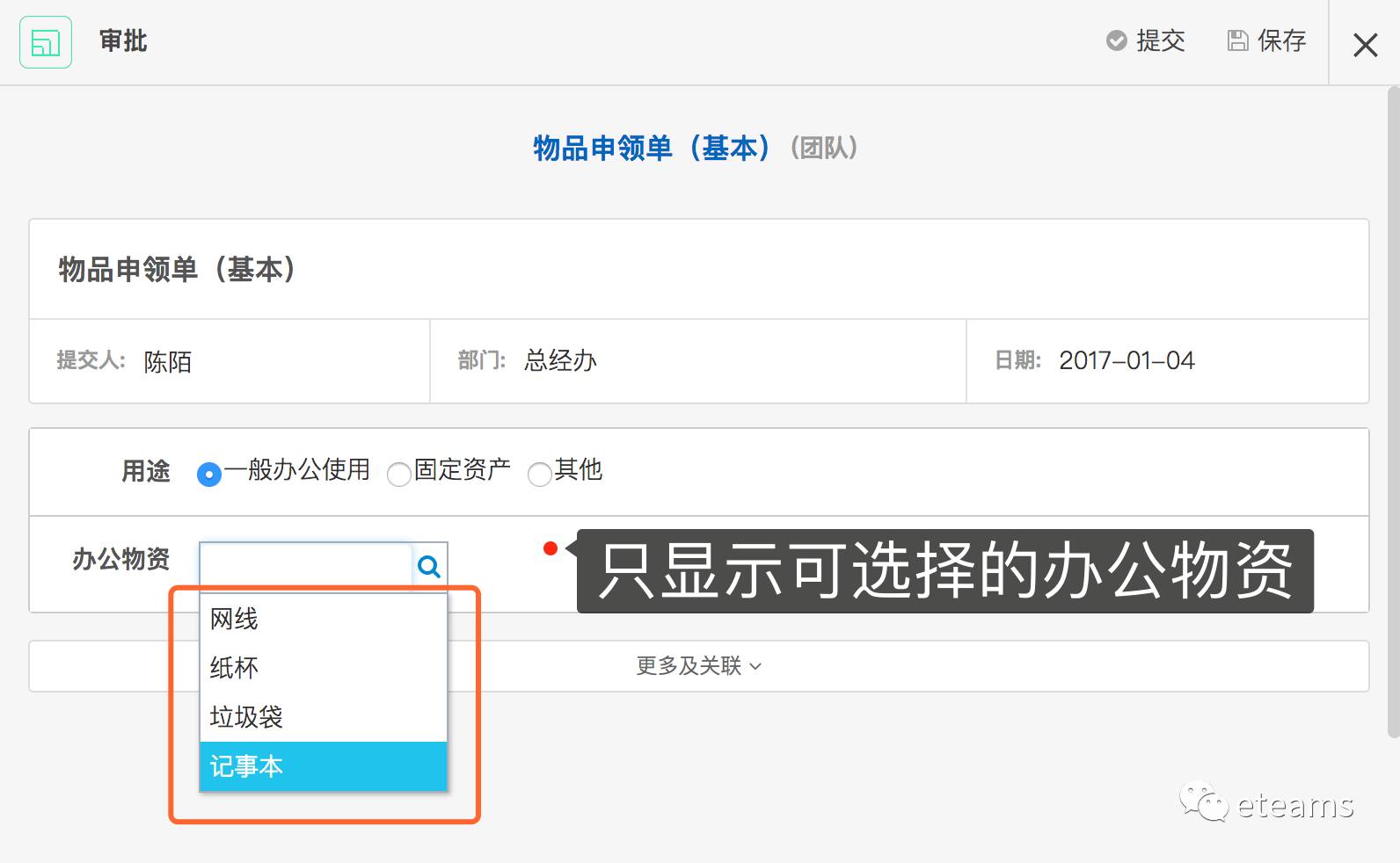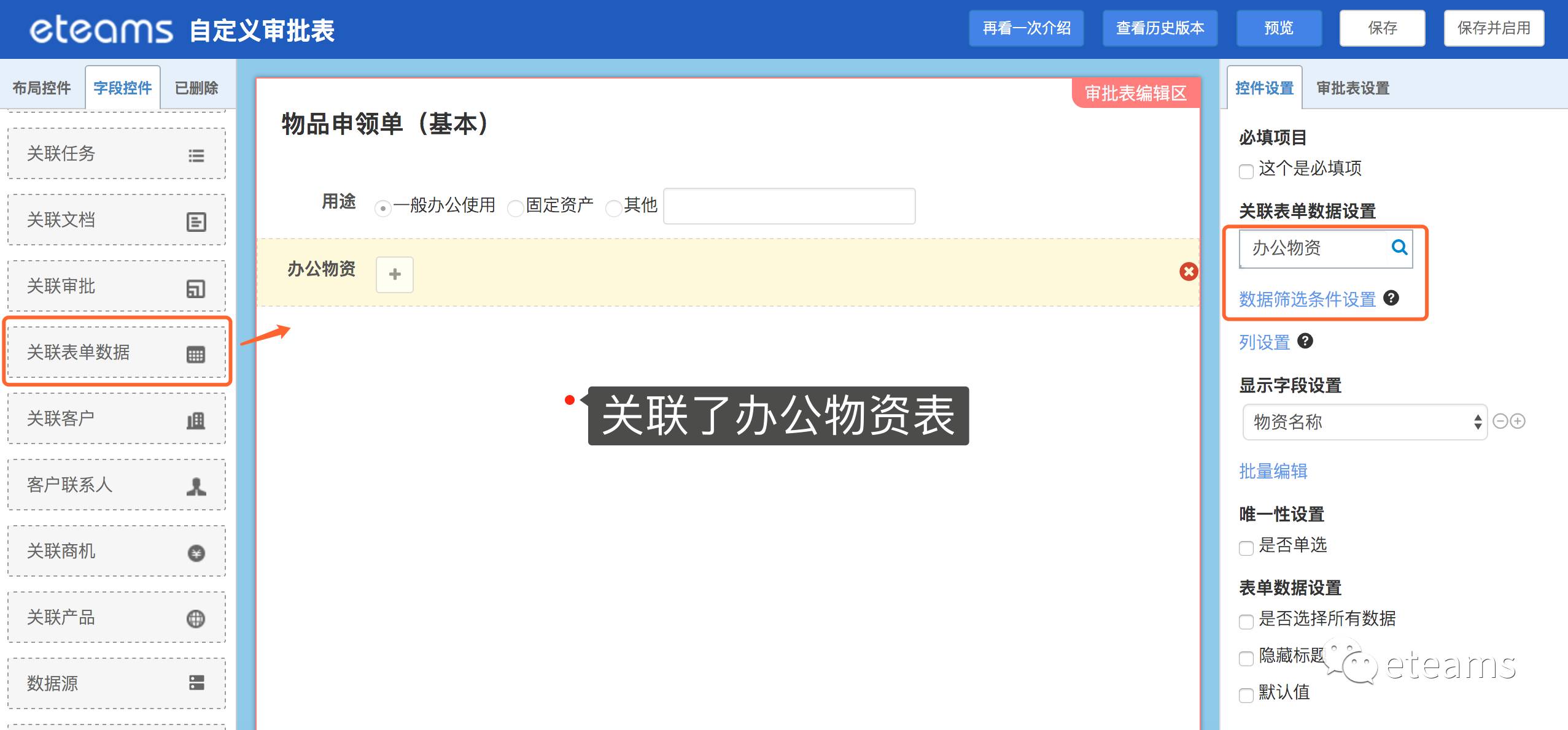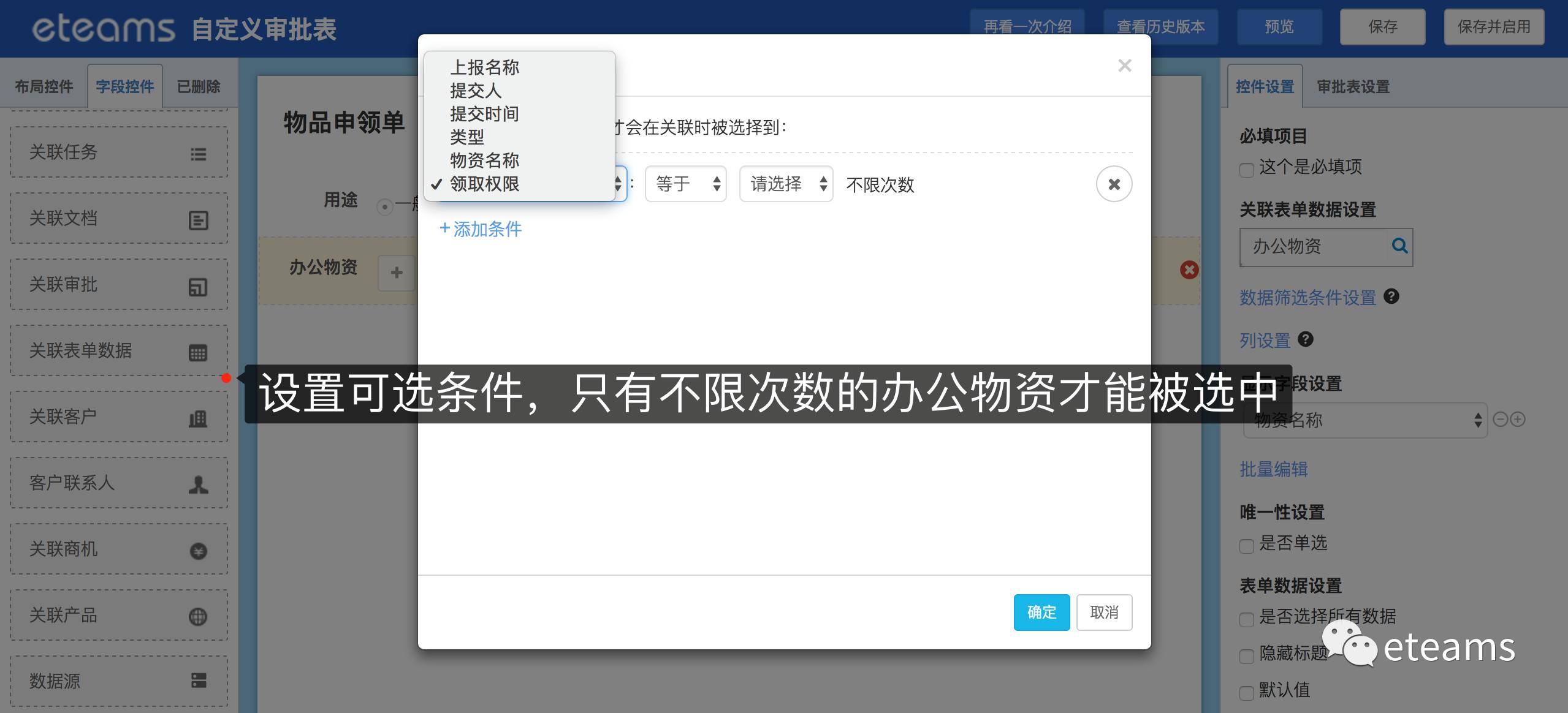 以办公物资的领取为例,办公用品申领表关联了公司的办公物资表,但是并不是所有的物资都可以随便领取,因此需设置可领取的物资权限范围。
