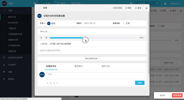 如上图所示,“日报补交时间范围设置”这个任务是此“2月第三周产品功能更新“的子任务,当这个子任务进度更新至50%时,则上级任务会自动按该子任务的权重1/3更新任务的进度情况为16%。