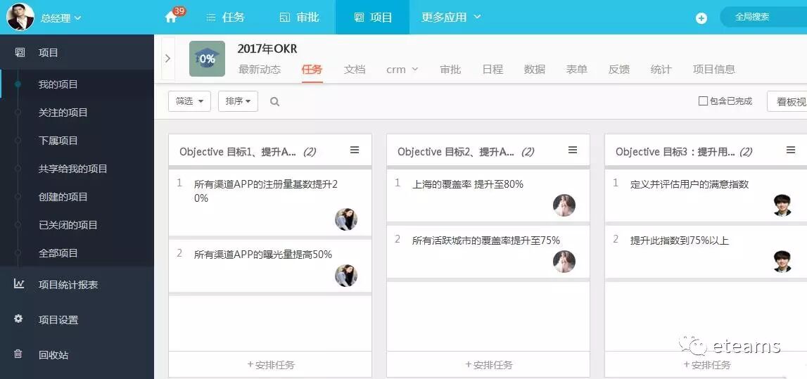 具体方式是将这个OKR部署到eteams的【项目管理】中,建立一个项目,明确目标并分解出结果。每个结果就是一个任务,制定好需要完成的时间,安排对应人负责。领导就可以透视整个项目更好的掌控发展方向和推进节奏,及时给出指导意见。如下图: