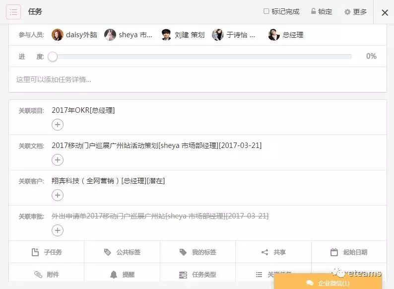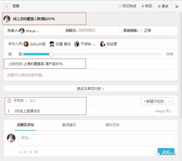 任务的负责人则需要对自己负责的任务进行进一步分解,例如可以将市场部负责的任务“上海覆盖率提高至80%”分解出“线上活动参加人数增加60%”“提高所有渠道粉丝活跃率到45% “”线下活动覆盖区域覆盖率提高到100%”3个子任务,设置好完成时间,安排给执行人员。负责实现“线下活动覆盖区域覆盖率提高到100%”的员工进一步分解为多个具体工作任务。在eteams可以清楚的看到工作逻辑,将时间和工作转变为扁平可视化。