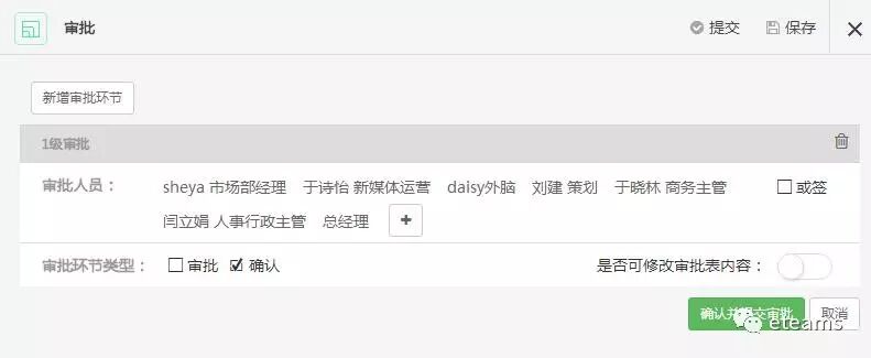 OKR的关键目标和结果一般需要提前1-2个月准备,一般在2、3月份就开始构思、准备第二季度的OKR了。准备工作比较简单,只要用eteams的【审批流程】新建一个审批,提交给所有需要参与制定目标和结果的团队成员,就可以了。