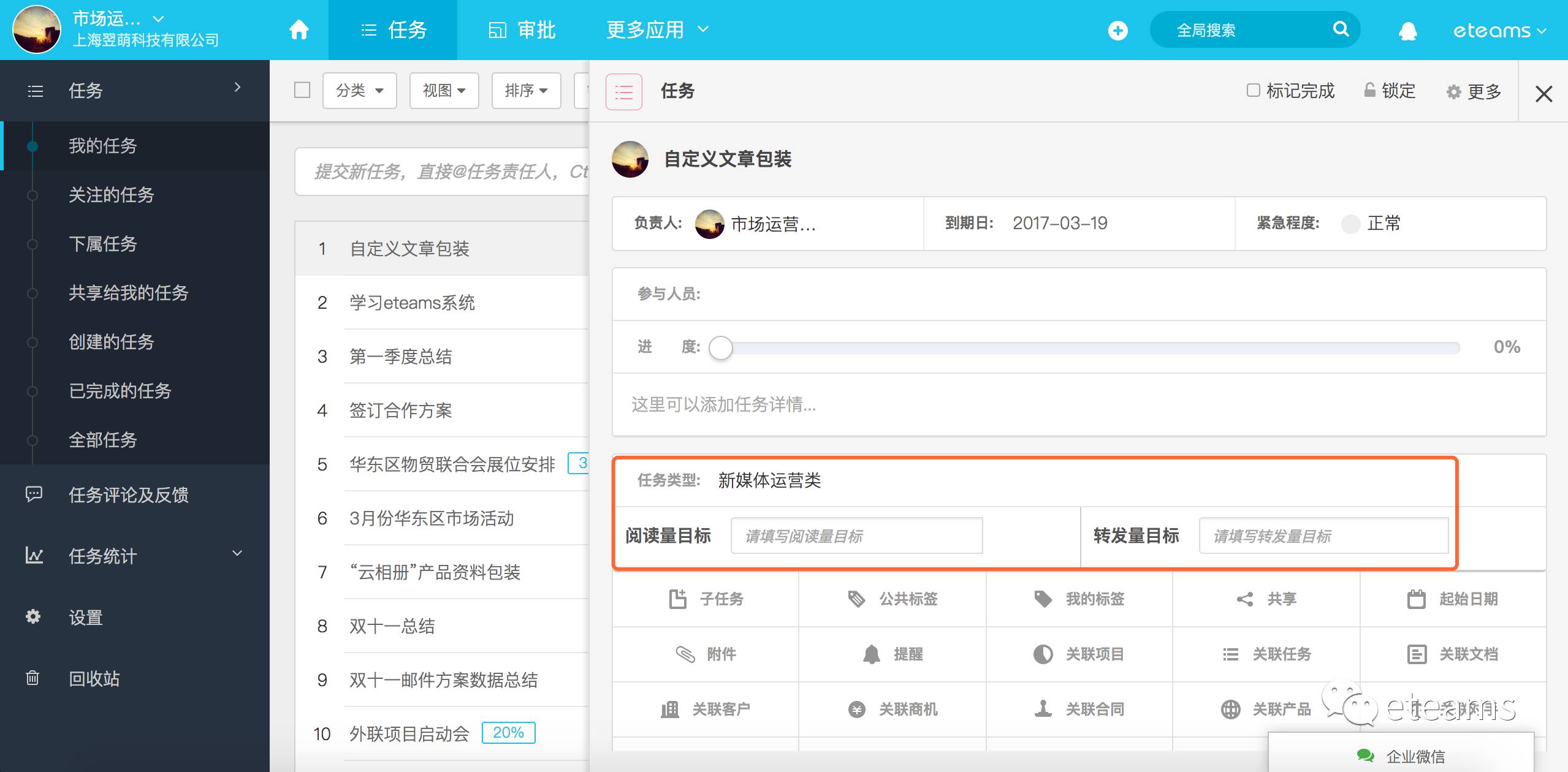 任务类型专属字段:除了可以设置任务的不同类型外,还可以设置该类型对应不同的关联字段。例如当类型为新媒体任务时,这个任务会增加相关的目标指标,如微信的阅读量、转发量等,任务的有效性更强。