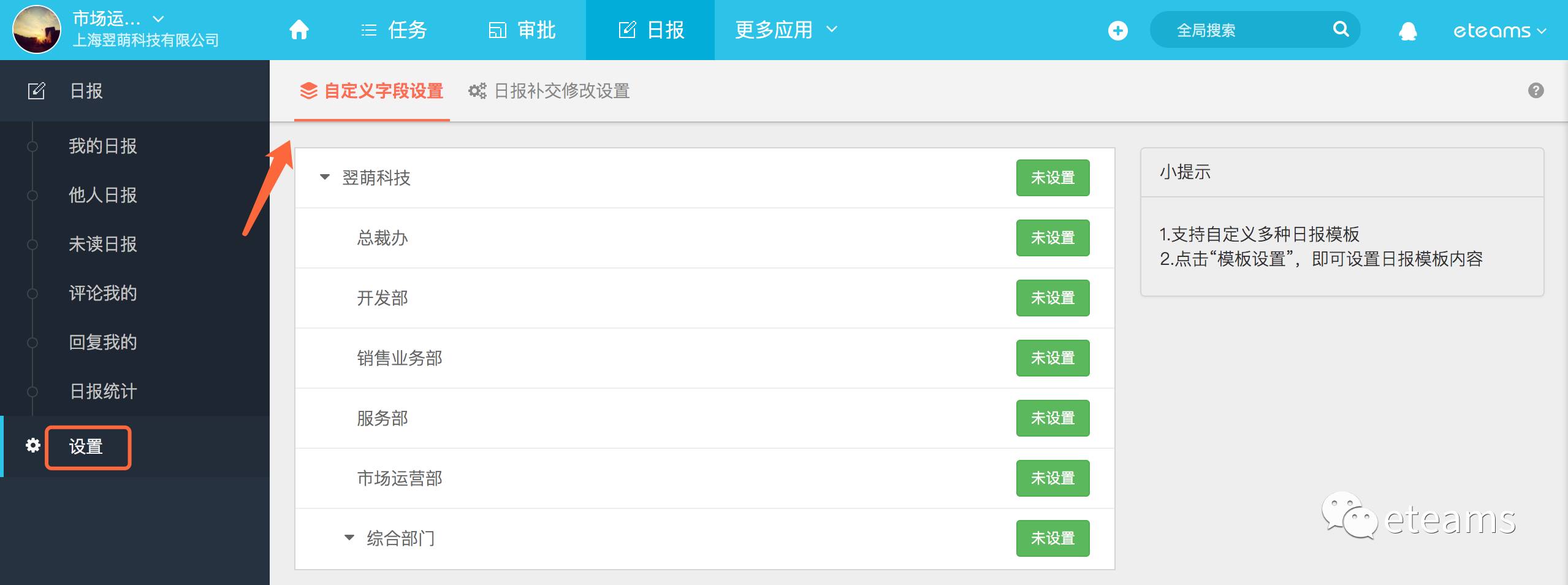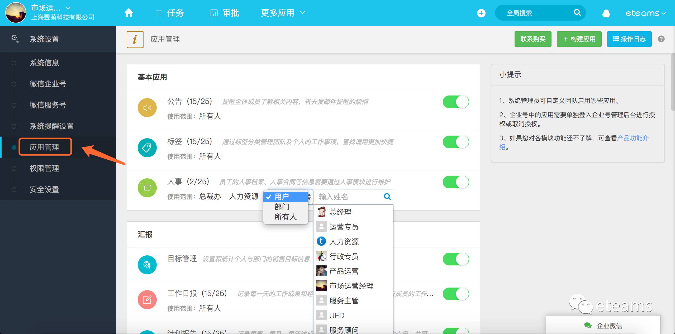 在eteams云办公系统中几乎包含了企业协作中的常用应用模块,但是当前阶段,由于每个企业规模和业务的不同,对于这些应用的使用程度必然存在着差异,甚至是企业中不同部门岗位职能的使用情况也各不相同。