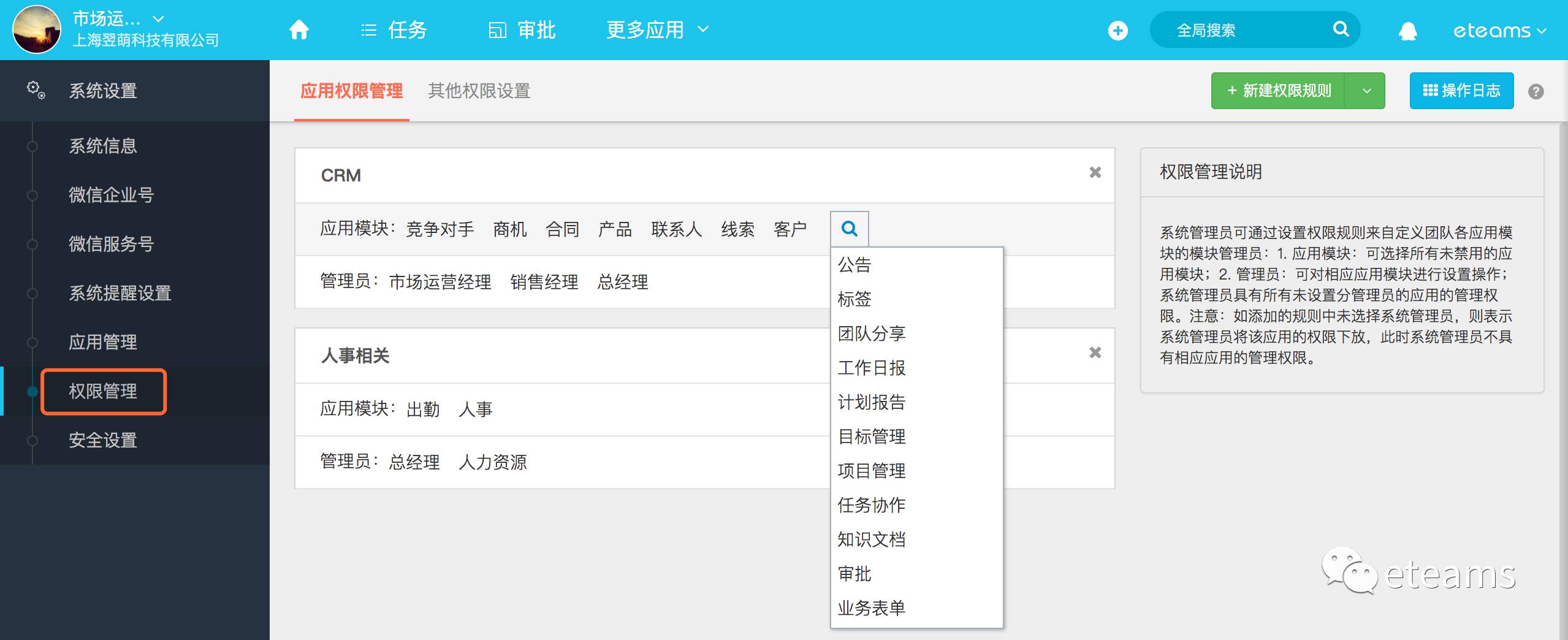 权限是企业软件的灵魂,eteams云办公系统的应用权限自然充分考虑了实际企业的场景需求。