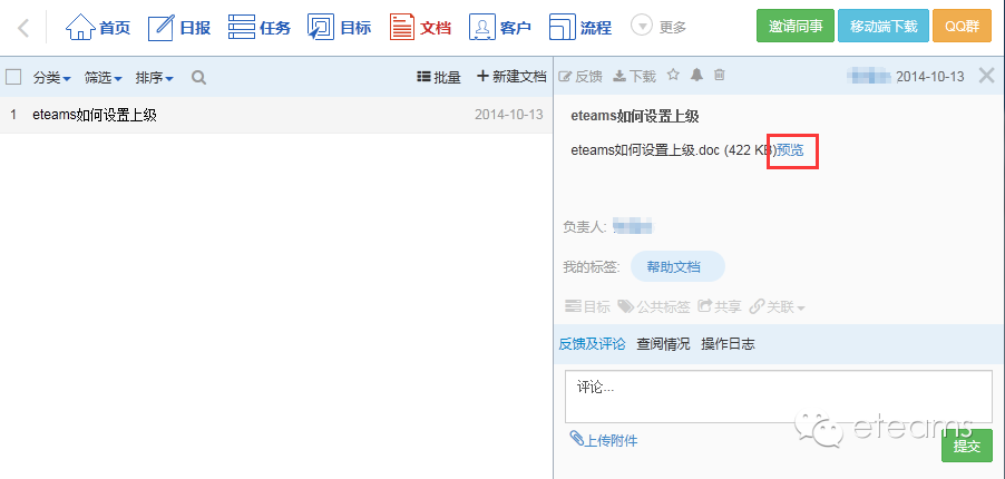 eteams增加了文档在线预览功能,目前支持office文档、PDF文档以及图片的预览,其他类型文档的预览功能陆续添加中,敬请期待。
