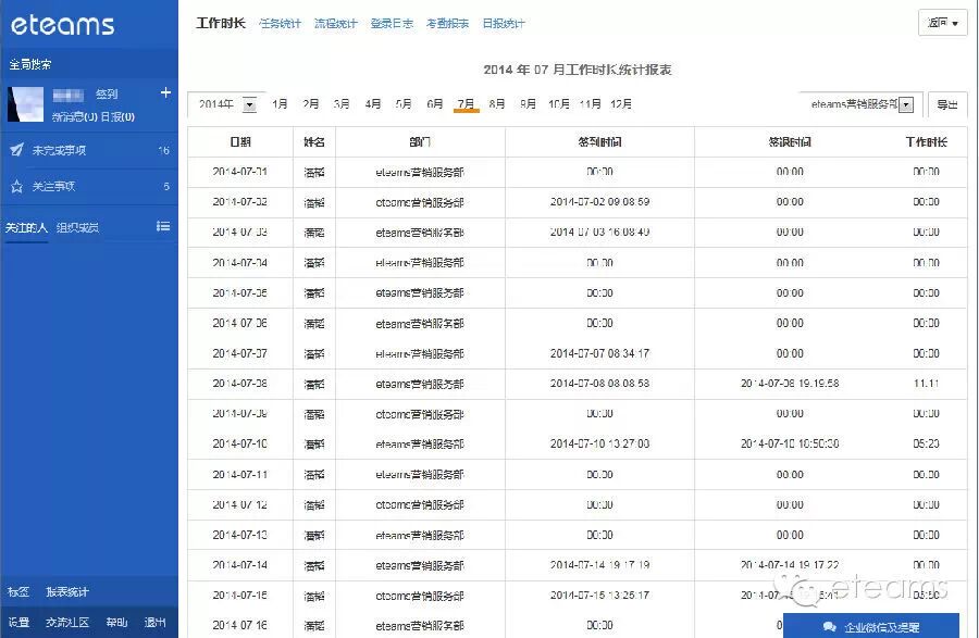 eteams新增加了工作时长的统计,现在可以方便的统计员工每天的工作时间,还可以将数据导出到excel。