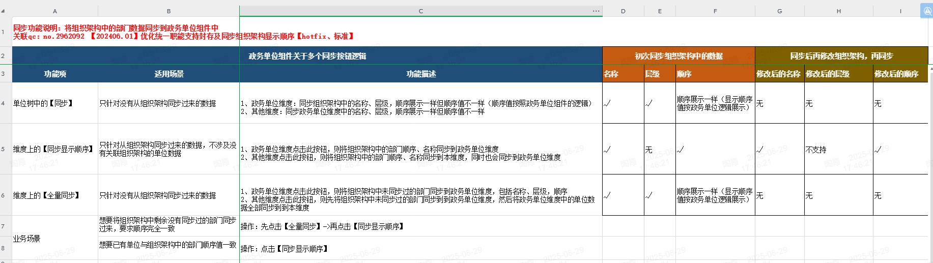 其他维度点击此按钮,则将组织架构中的部门顺序、名称(包括修改后的顺序、名称)同步到本维度,同时也会同步到政务单位维度