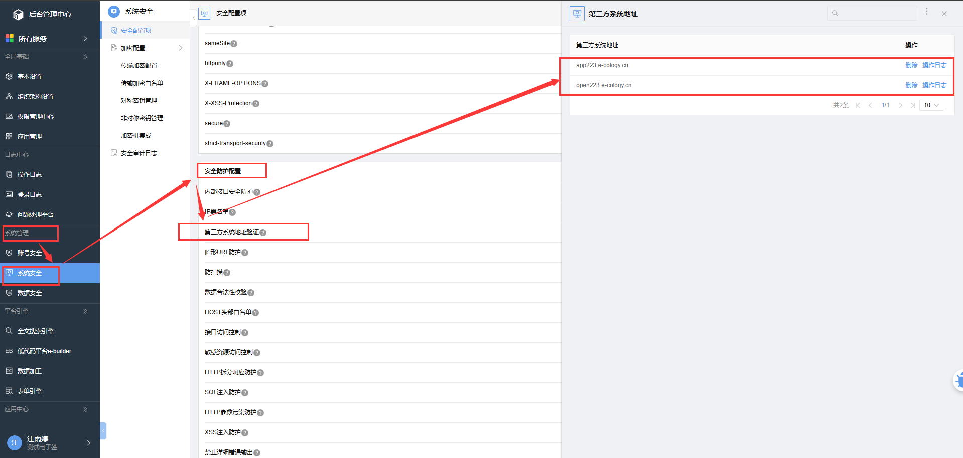 2、将这两个地址配置到E10后台管理中心-系统管理-系统安全-安全配置项-安全防护配置-第三方系统地址验证中