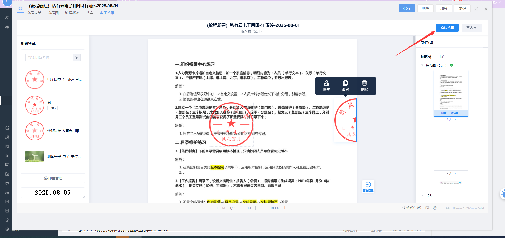 注意:需要指定所有内部企业的组织签章的签署位置和唯一的印章
